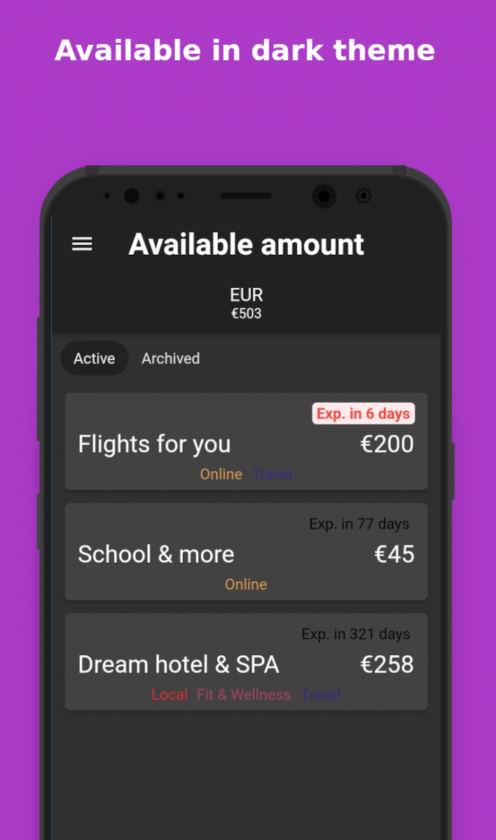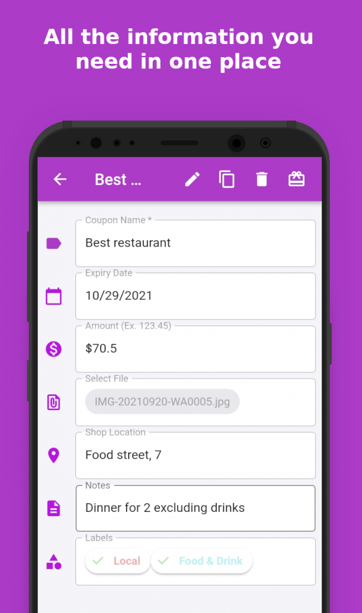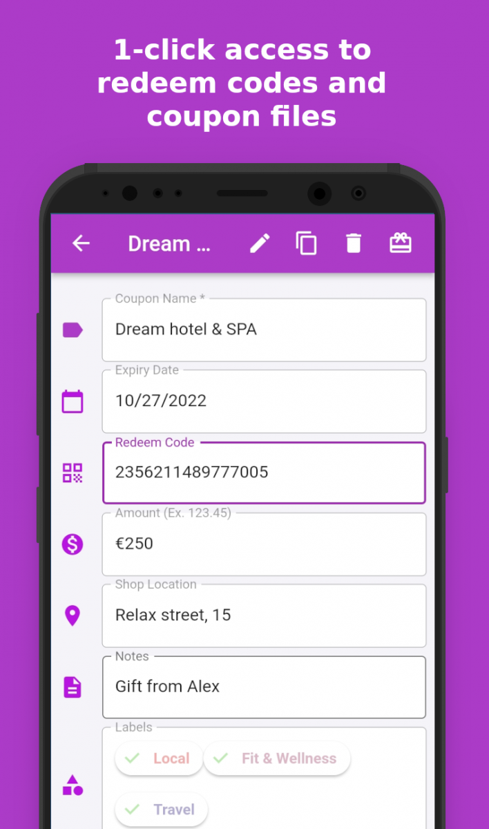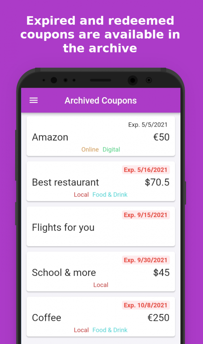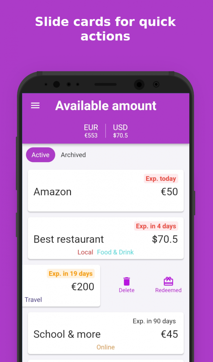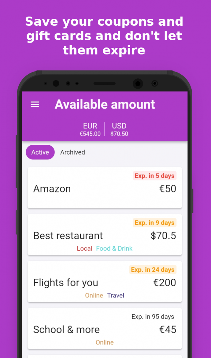 Organize and manage in one app any kind of coupon, voucher or gift card, from local stores or digital, the ones received as a gift or in the mail box or from your local favorites.